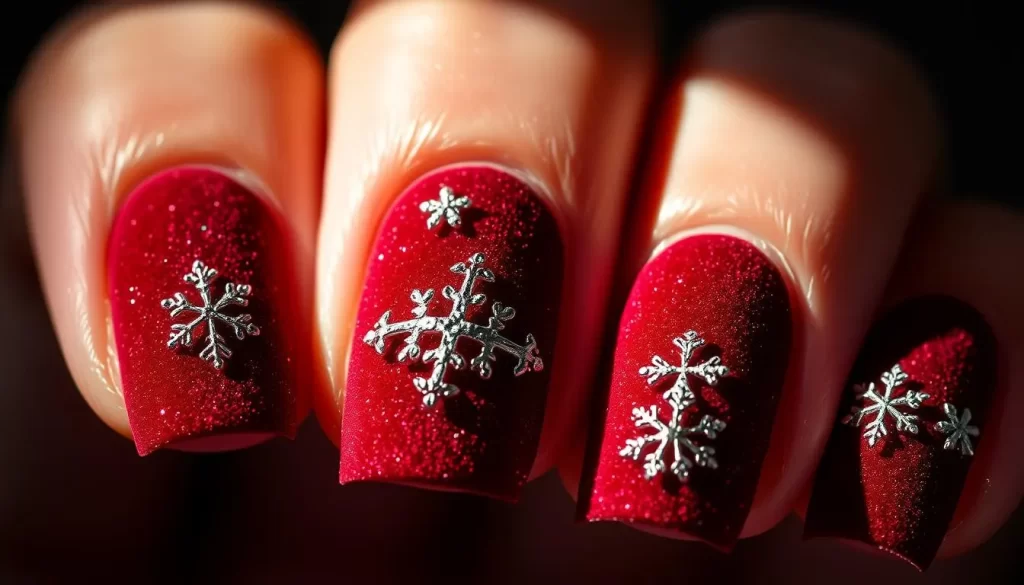 Velvet nails are a winter favorite, giving your nails a cozy and luxurious feel. You can use velvet nail polish or add velvet powder on top of your polish. Velvet nails are great for cold weather, bringing warmth and comfort. Try pairing them with rich jewel tones or metallic colors for a chic winter look.